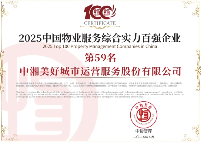公司信用评级为“AAA”,蝉联“中国物业服务企业100强”“中国物业国有企业50强”等称号,先后荣获“中国城市服务优秀品牌企业”“中国智慧城市服务领先企业”“中国特色物业服务领先企业”“全国青年文明号”“湖南省文明标兵单位”等国家级、省部级荣誉。