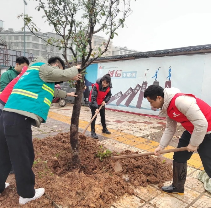 活动现场,党员先锋队与志愿者们分工协作,挥锹铲土、扶苗培土、提水浇灌,配合默契。经过数小时忙碌,原本缺失的行道树区域焕发新绿,一株株新栽苗木整齐排列,为城市道路增添盎然生机。