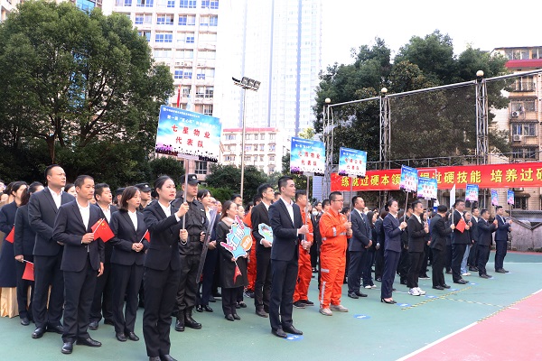 上午八点半,竞赛在庄严的国歌、司歌声中拉开序幕。来自集团本部及集团下属子公司七星物业、兴发物业、汇博物业、电梯公司、酒店公司、商管公司、环境公司、修缮公司共9组代表队精神抖擞、口号嘹亮依次闪亮登场。