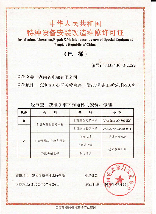 2018年7月27日,湖南电梯公司荣获由湖南省质量技术监督局颁发的“特种设备安装改造维修许可B级证书”,标志着该公司取得了全面参与市场竞争,全面拓展电梯业务范畴的资格。