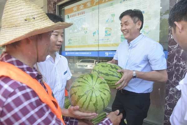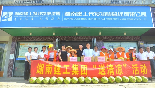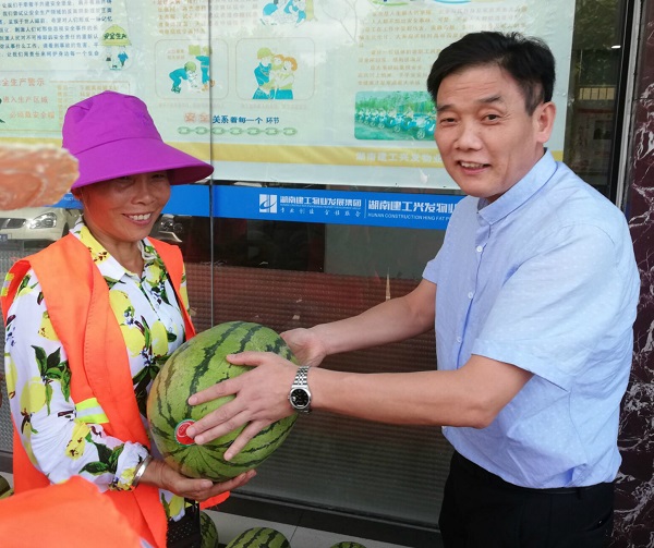 在项目现场,湖南建工集团董事会秘书吴正伟首先仔细询问了兴发物业星沙五标项目的基本情况,了解了长沙县2017-2019年城市环卫清扫保洁服务外包项目情况,对该项目作出的成绩予以了高度赞誉,对环卫工人们冒酷暑、战高温,毅然坚守岗位,为净化城市环境做出的贡献表示感谢。并随即为员工发放西瓜、夏桑菊颗粒、藿香正气水等防暑降温物品。