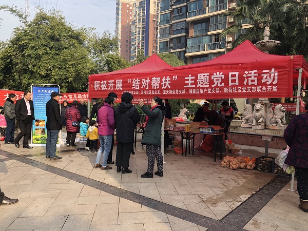 12月15日至17日,株洲市建设街道沿河社区党总支、汇博物业党支部、湖南蓝天物业管理有限公司党支部、株洲市桂花街道新荷社区党支部共同开展“结对帮扶”主题党日活动。在小区内设立农副产品销售点,切实对邵阳市绥宁县武阳镇雀林国学村进行精准扶贫。