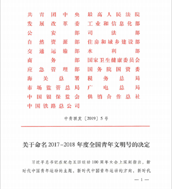 近日,共青团中央办公厅印发《关于命名2017-2018年度全国青年文明号的决定》(中青联发〔2019〕5号)文件,集团下属子公司湖南建工兴发物业管理有限公司洋湖分公司荣获2017-2018年度全国“青年文明号”荣誉称号。