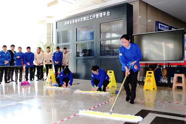 我的主场我做主!只见21位保洁员参赛选手手脚麻利、动作规范,在分项短短五分钟时限内,先后完成了地面推尘和玻璃清洁两项竞赛项目。面对时间紧迫、工序复杂、细节严苛的赛场形势,他们稳定发挥、所有步骤一气呵成。为他们点个赞!