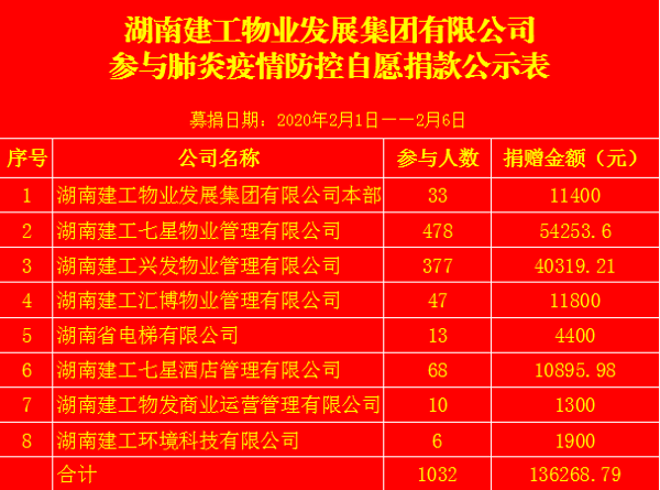 为深入贯彻落实党中央、国务院、省委、省政府及省国资委关于做好新型冠状病毒感染的肺炎疫情防控工作的有关精神,积极响应建工集团党委的募捐倡议,2月1日,集团党委发出疫情防控自愿捐款倡议。所属各子公司干部职工纷纷响应号召、积极伸出援助之手,用行动为疫情严重地区加油鼓劲。截至2020年2月6日,集团共有1032名党员群众参与捐款,募集善款136268.79元,并已于2月7日悉数转至建工集团对口账户。