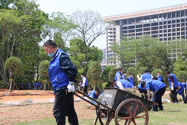 下午一点半,200余名志愿者们准时到达省政府机关大院运动场,集团董事长吴湘海现场部署,集团党员领导班子成员悉数上阵。大家以组为单位,分区域分步骤开展义务劳动,一部分人戴上手套拔除杂草,一部分人挥舞铁锹起草皮,其余的人则负责铺草皮、种植树苗、浇水、清理杂物垃圾……各个步骤高效衔接,有条不紊地进行。志愿者们忙碌的身影活跃在运动场内各个角落,鲜艳的蓝色马甲与绿色的草皮相互辉映。