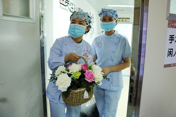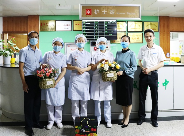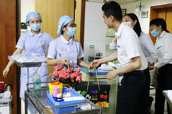 七星物业副总经理李伟、杨梅莲带领浏阳市中医医院物业服务中心工作人员,逐层逐科室为医院每个护士站送上附有祝福卡片的鲜花和新鲜水果,一张张小卡片都是由物业服务中心的工作人员亲手写下,一字一句传递的都是大家对医护人员满满的谢意和深深的敬意。美丽的白衣天使们收到这份特别的节日礼物非常惊喜,脸上露出了开心的笑容,转身又投入到忙碌的工作中去。