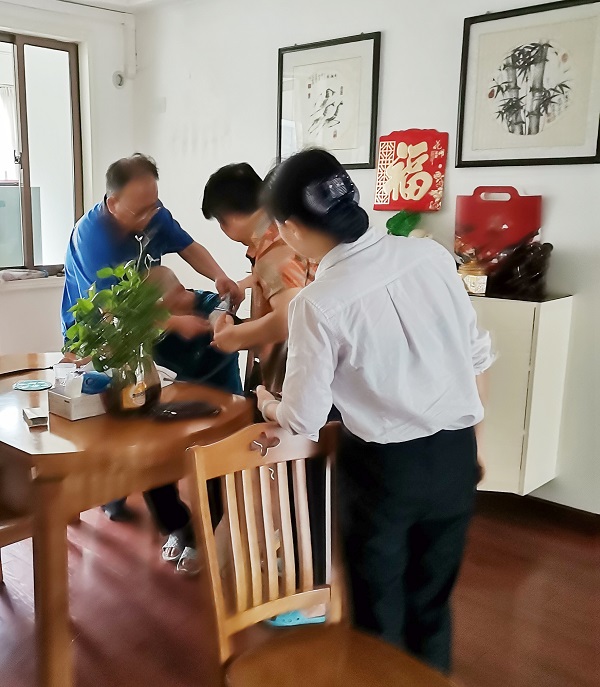 在等候救护车的过程中,物业人员全程陪伴、仔细看护。由于业主出现呕吐、头晕、全身冒汗的症状,严秀华一边为业主擦拭汗水、测量血压,一边与业主交谈让业主保持清醒,同时还不停地安抚业主老伴。发现业主全身汗湿后,为了避免业主受凉,物业人员还配合业主老伴帮助业主及时更换了干净衣服。另外一边,客服人员联系了业主女儿告知其具体情况,并通知秩序维护人员将小区大门打开,以便救护车能畅通无阻地驶入小区,为救人节省时间。