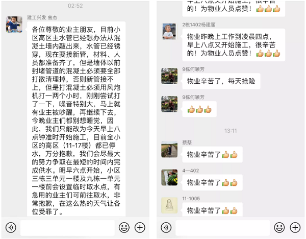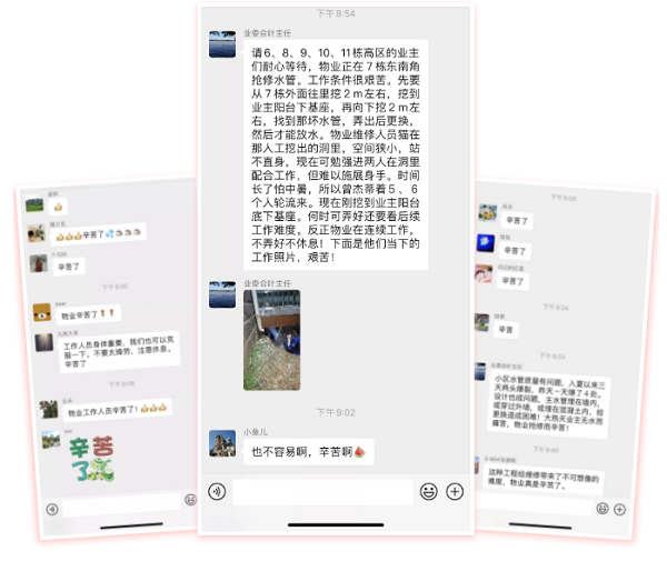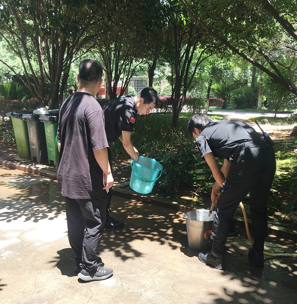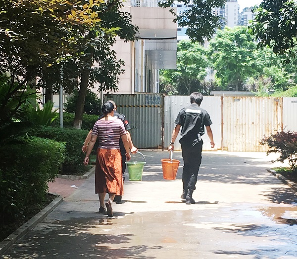 爆裂的水管埋在50公分厚的钢筋混泥土里面,必须打穿钢筋混凝土才能更换水管,维修起来工程量非常大。服务中心的全体工作人员分工协作、高效配合,共同投入到维修工作中来。抢修期间,工程人员手拿铁锨、破碎锤等专业工具,对埋在地下的供水主管道旁的部分障碍物进行破除,并及时将维修进度告诉客服人员,让客服人员发送至业主群,确保业主实时了解抢修进展情况;客服人员通过电话、张贴公告和发送微信等方式向业主解释小区停水的原因;秩序维护人员在小区设置了三个取水点,并给需要的业主送水上门,保障业主的正常生活用水;保洁人员则配合清理现场,确保小区的环境卫生。