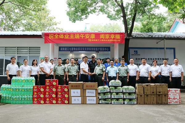 粽子飘香,品味端午。为进一步弘扬中华民族优秀传统文化,丰富节日内涵,在集团全面开展“赛业绩,展英才”百日会战活动的重要时期,6月23日下午三点,国防科大前沿交叉学科学院管理保障处处长王培云、副处长高旭坤一行到物业服务中心慰问基层员工,七星物业党支部书记、董事长胡红波,副总经理刘晓东、沈超等陪同慰问。
