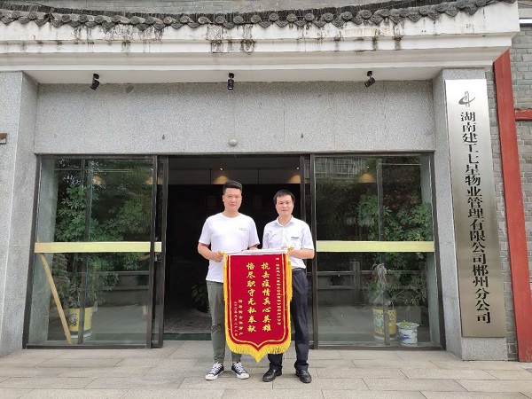 6月24日下午,天空湛蓝,阳光明媚,郴州裕后街联合工会捧着一面鲜红的锦旗来到七星物业裕后街服务中心办公室,锦旗落款署名为“裕后街全体商户”,上面印着“抗击疫情 真心英雄 恪尽职守 无私奉献”十六个饱含真情的烫金大字,满载着全体商家对七星物业工作人员的感谢。在新冠肺炎疫情防控战中,七星物业人逆向而行挺身而出,对街区进行消杀,对外来人员进行摸排,对管理区域内人员逐一进行体温检测,竭尽所能保障了业主单位居民生命安全,创造了良好的商业运营环境,充分展现了物业好管家无私奉献、守土有责的高度责任感。