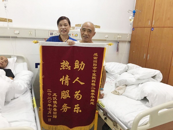 7月3日上午,浏阳市中医医院肺病二科吴春回老先生专程来到服务中心,将一面鲜红的锦旗送给七星物业浏阳中医医院服务中心临床部护工李平。锦旗上印着的“助人为乐,热情服务”八个字蕴含着吴老先生的感激之情和对李平同志工作的的高度肯定。