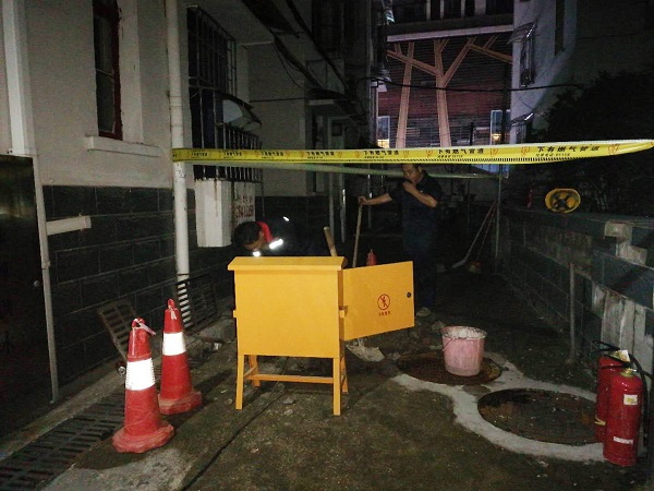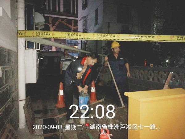 30多分钟后,燃气公司检修人员赶到现场,根据小区现场情况,排查确认为11栋2单元前埋地低压分支管存在燃气泄漏。工作人员在物业的配合下立即组织施工单位对漏气处进行开挖查找。晚上23时20分,在施工队、燃气公司、物业人员等多方的共同努力和持续奋战下,终于找到了埋地管道的漏点,并及时进行了紧急处理,有效将危险因素遏制在源头处,成功化解了燃气泄漏问题。