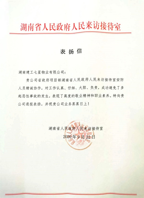 9月22日,七星物业喜获湖南省人民政府人民来访接待室发来的表扬信。信中对七星物业省政府项目部安防人员高度的敬业精神和职业素养表示肯定,对安防人员精诚协作避免多起恶性事故发生予以表扬。