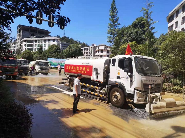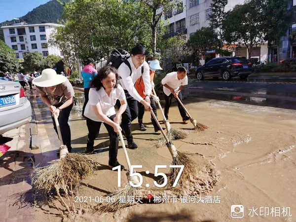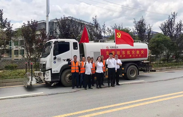 由于洪水肆虐,道路损毁严重。6月5日,洪水褪去后,桂东县道路上堆满垃圾和淤泥,严重影响广大市民的出行安全和城市交通秩序,且高考在即,必须紧急完成道路清淤保畅。接到桂东美好公司援助通知后,集团子公司兴发物业即刻行动,星夜集结力量,组建了一支由十余名党员和两台高压清洗车组成的抗洪救灾队伍,于6月6日凌晨五点从长沙出发赶赴桂东。受持续暴雨影响,道路路况极差,湍急的洪水和泥石流将道路冲毁,救灾队伍克服重重困难,跨越340公里驰援桂东救灾一线。