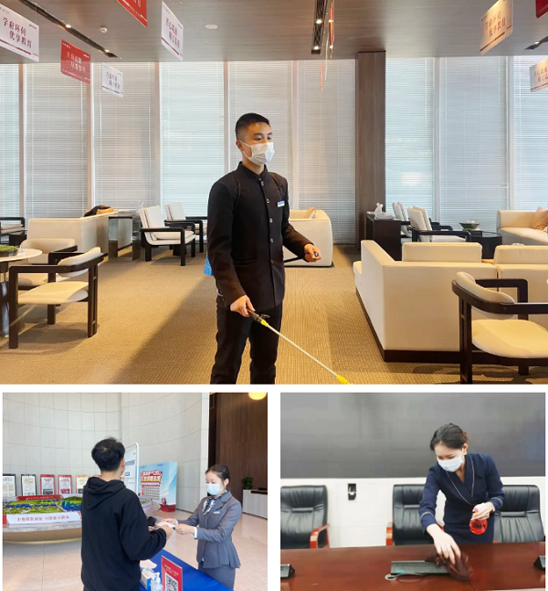 兴发物业各基层单位持续加强对服务项目的公共区域、楼梯通道、会议室、电梯等区域进行全面消毒,并用喷雾机对垃圾桶、电梯等部位进行循环式无死角消杀。