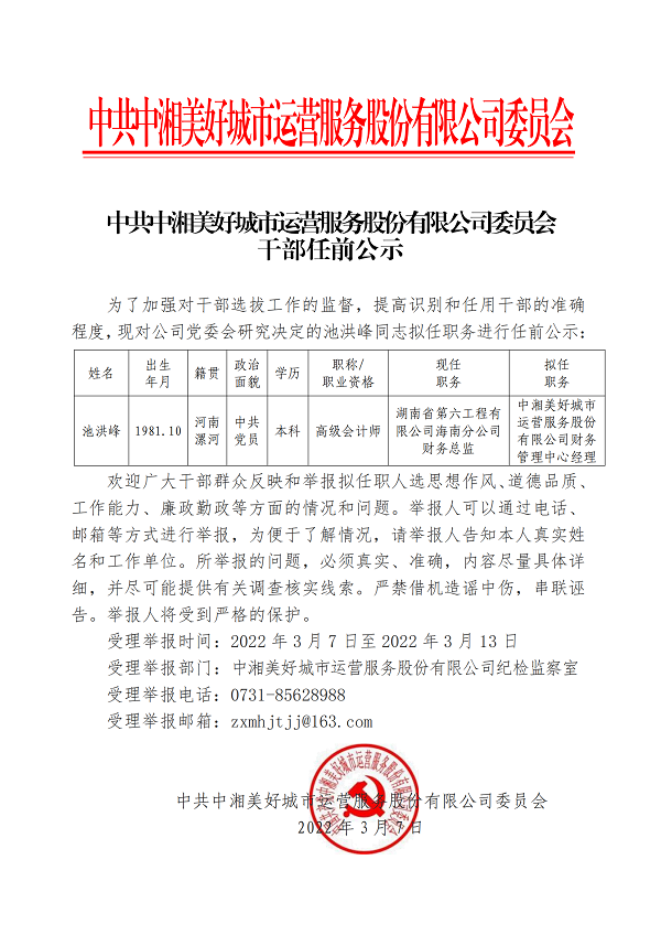 中共中湘美好城市运营服务股份有限公司委员会干部任前公示