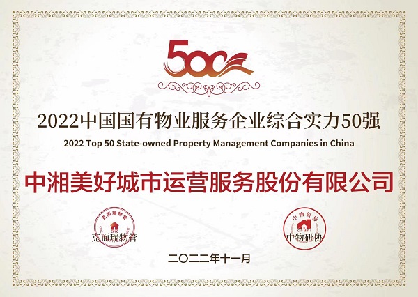 中湘美好公司凭借领先的市场地位、丰富的行业经验及强大的业务实力,再添喜报:荣获“2022中国国有物业服务企业综合实力50强”,排名第37位,位居湖南省国有物业服务企业首位!