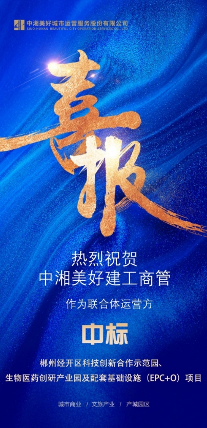近日,中湘美好建工商管公司作为运营主体,与湖南建投基础投相山公司、中机国际工程设计研究院有限责任公司组成联合体,成功中标郴州经开区科技创新合作示范园、生物医药创研产业园及配套基础设施“EPC+O”项目(设计、采购、施工+运营),中标总金额约5.9亿!建工商管将为项目提供策划定位、设计优化、产业招商、运营管理等专业服务。
