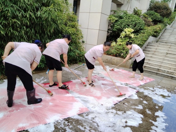 地毯清洁是颇受欢迎的便民服务活动之一。只需交给物业人员,便可轻松获得焕然一新的地毯。高压水枪冲洗、排刷清理,大大小小的地毯在小区空地上有序排开,物业人员干劲十足地处理着污渍,原本灰蒙蒙的地毯洁净如新。业主每天进出家门看见干净的地毯,心情也会舒畅不少。