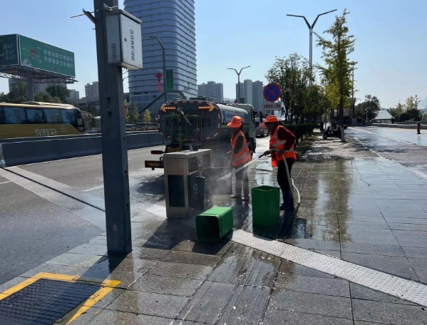 保洁部对一线人员及设备重新进行科学分工、铺排,加班加点对武陵山大道进行全面的清扫工作,精细化冲洗人行道、地下通道、清理油污等,并及时更换沿线破损的垃圾桶,确保武陵山大道卫生质量得到全面提高。