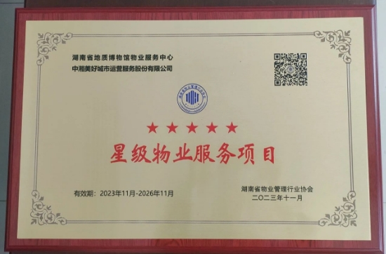 经过湖南省物业管理行业协会和长沙市物业管理协会两级检查,湖南省地质博物馆物业服务中心成功获评“湖南省五星级物业服务项目”。