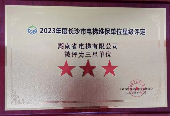 在长沙市特种设备安全管理协会组织开展的2022-2023年度长沙市电梯维保单位星级评定中,中湘美好电梯公司凭借良好的企业经营能力、工作实际、发展空间、履行社会责任、行业口碑、服务满意度等,荣获三星级电梯维保单位,实现了由二星级单位(2018年度)到三星级单位的质的飞跃。