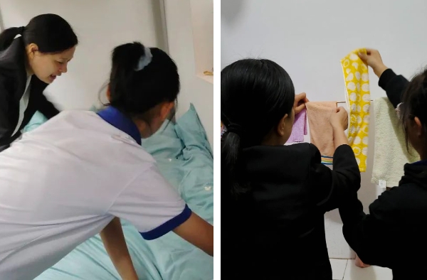 许多孩子进入学校住宿,都是第一次离开家庭,离开妈妈独立生活,而生活老师无形中充当了临时“妈妈”的角色。生活老师每天早、晚进行“叫醒”“入寝”服务,帮助学生整理内务,为他们处理遇到的大小生活问题。孩子们也喜欢跟生活老师谈心,亲切叫她们“李妈妈”“张妈妈”。某次半夜一个学生发烧,生活老师第一时间赶到他身边,紧急降温处理后立马联系校医诊治,并全程陪护在学生身边,直到家长赶来。