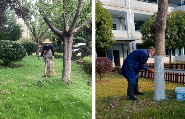 绿化部用心护理校园内绿化区域,高温天气防暑降温持续为绿植浇水,防治害虫,在寒冷的冬季提前为树木做好防寒保暖工作,给树木“穿上白衣”,为美化校园环境当起了“化妆师”。