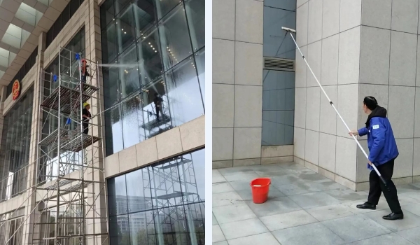 机关服务中心机关院管理部部长龚天波检查指导会堂大理石外墙清洗工作。
