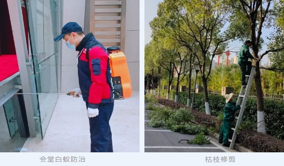 负责会堂绿化环境养护工作。修剪、清理会堂周边乔灌木枯枝、病枝、下垂枝等,补涂白乔灌木,修剪周围草坪,补栽补种缺损草坪区域,做好会堂白蚁防治工作。