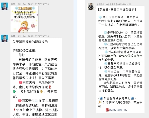 为防范极端天气带来的气象灾害,公司发文《关于做好应对冬季低温雨雪天气的通知》,要求各住宅项目严阵以待,制定预防措施,针对暴雪天气迅速启动应急预案,通过微信朋友圈、业主群、小区宣传栏等方式推送天气信息及温馨提醒,提前做好防灾避灾准备,确保广大业主安全出行。