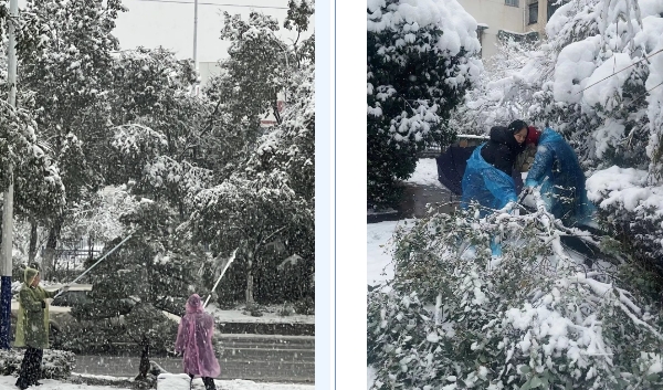园区不少树木因积雪过多枝干弯折,为避免树木枝干断裂,影响园区人、车的出行安全,造成道路堵塞,物业工作人员不畏严寒,拿起长杆,敲击树枝,清理树干的积雪,干劲十足又忙碌奔波的身影构成了一道道雪天独有又亮丽的风景线。来回忙碌的身影,“咔嚓”破冰的铁铲,现场演奏出一曲别样的“破冰交响曲”。从黎明到傍晚,从出入口到各干道,全力铲冰除雪的身影随着积雪的消失而散去。