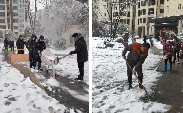 飘雪沉淀,厚厚的白雪覆盖了园区内外,银装素裹之下,大家的回家路变得美丽却难行。公司各住宅项目迅速启动低温雨雪冰冻天气应急预案,组织工作人员开展“家园保卫战”。