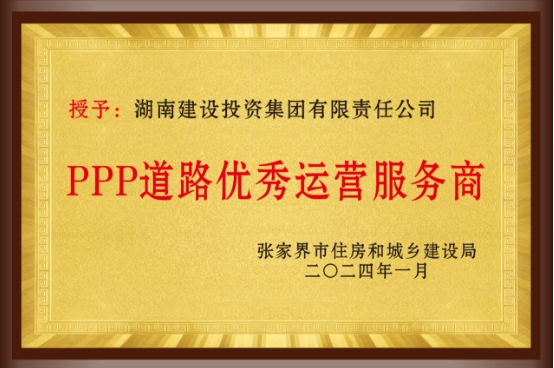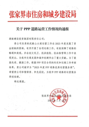 2024年1月,中湘美好张家界武陵山大道ppp项目喜获张家界市住房和城乡建设局授予的“PPP道路优秀运营服务商”荣誉称号。