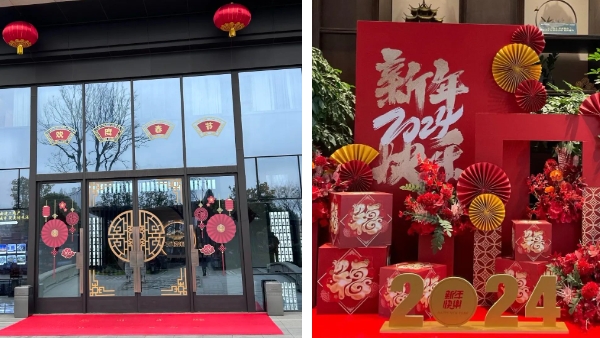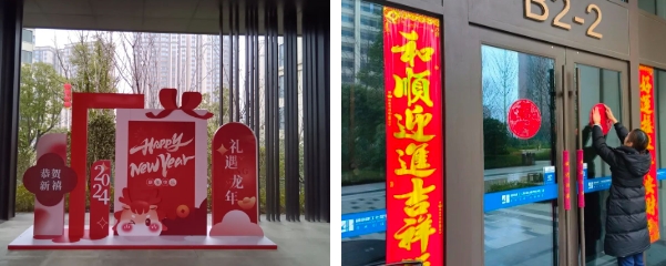 东玺台物业服务中心以展现中华民族传统文化的魅力为主题进行节日氛围布置。大堂玻璃门张贴以新春喜庆元素为主的年味窗花、对联,同时在大堂出入口顶梁各处悬挂大红灯笼,既高雅简洁,又体现节日气氛。其它重点区域用红绸灯笼和1000余串三连串红灯笼进行点缀,着力打造园区喜庆热烈的视觉效果,营造出喜迎龙年春节的欢乐氛围。