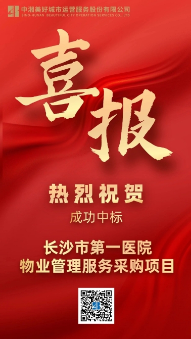 近日,公司成功中标长沙市第一医院物业管理服务采购项目。中湘美好将以实干作回应,用实绩作回报,持续为医院工作人员及患者创造更舒适的工作及就医环境。