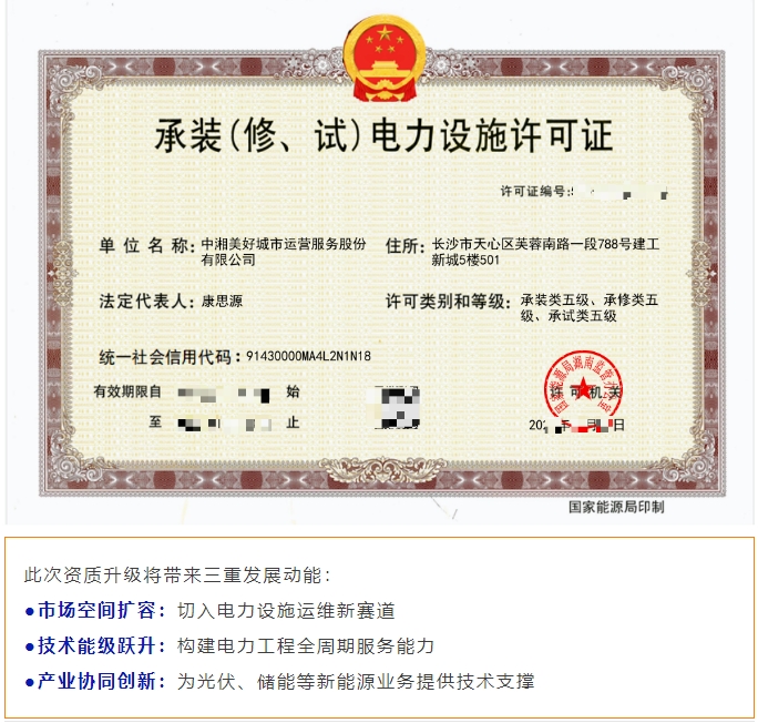 近日,公司正式通过国家能源局湖南监管办公室审核,成功取得承装(修、试)五级电力设施许可证。此项资质标志着公司可全面承揽35千伏以下电压等级的电力设施安装、维修及试验业务,实现电力工程领域服务能力的重大突破。