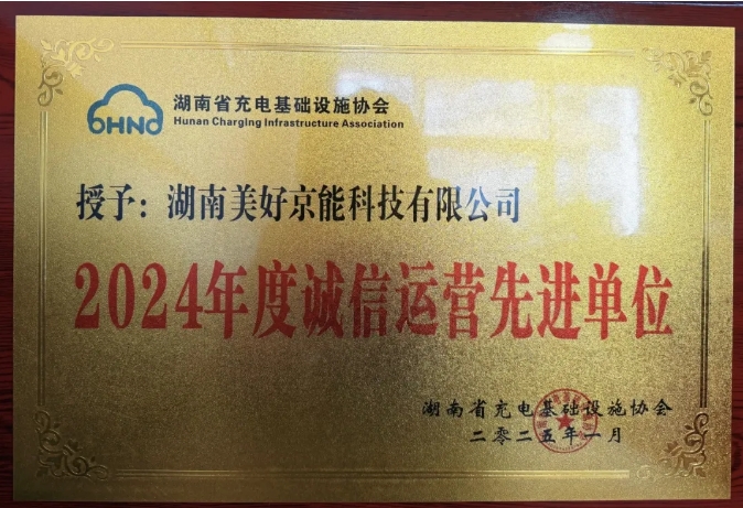 近日,在湖南省充电基础设施协会第二届理事会第二次会议上,中湘美好公司旗下湖南美好京能科技有限公司凭借卓越表现,获评2024年度“诚信运营先进单位”。协会高度认可美好京能在诚信经营、技术创新及社会责任领域的标杆作用,盛赞其为行业规范化、智慧化发展的典范。