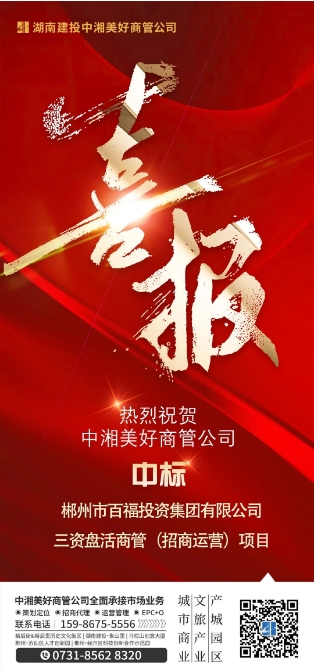 4月7日,中湘美好商管公司成功中标郴州市百福投资集团有限公司的三资盘活商管(招商运营)项目。此次中标是公司在郴州区域实现多业态服务纵深布局的重要里程碑——通过整合城市商业、文旅产业及产业园区资源进一步完善"三资盘活"业务生态链。同时也是公司进一步深挖郴州区域市场潜力,充分把握“三资盘活”市场机遇的重要营销成果,对构建起覆盖多元化业态的综合运营服务体系具有积极意义。