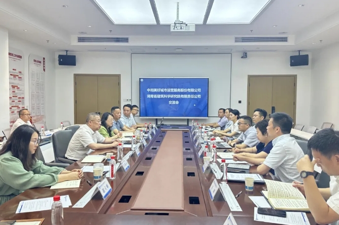 戴勇军对中湘美好一行的到访表示热烈欢迎,并介绍了省建科院在建筑科研、技术创新等领域的核心优势,重点阐述了“工程医院” 在城市更新领域的创新模式和实践成果,特别是在EPC+O模式上,希望与中湘美好结成联合体,实现优势互补、协同发展。此外,还介绍了省建科院在楼宇智慧化、运维数字化领域已形成的完整技术链条,希望在数字化、智能化管理方面为中湘美好的发展赋能。