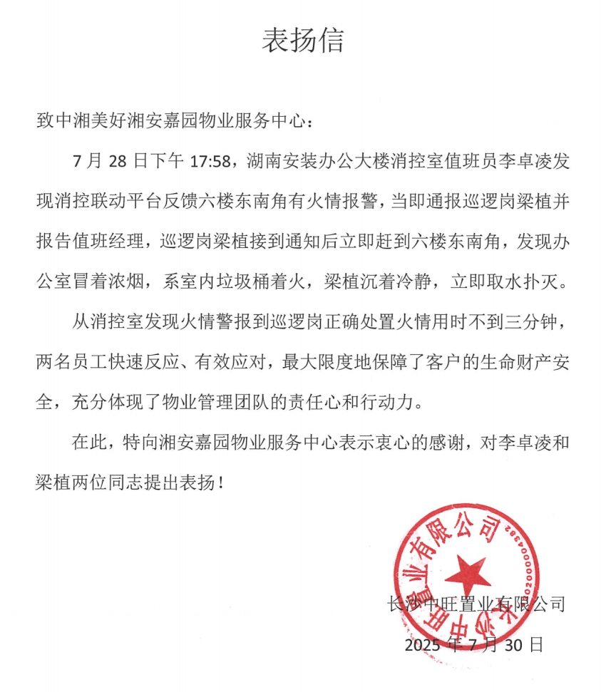 火情警报响起,3分钟内完成“发现—到场—处置—确认“,零伤亡、零损失!7月28日下午,湘安嘉园办公楼物业服务中心秩序员李卓凌、梁植共同完成一场“极速灭火”。事后,长沙中旺置业有限公司发来表扬信,点赞:“教科书式操作,值得推广!”