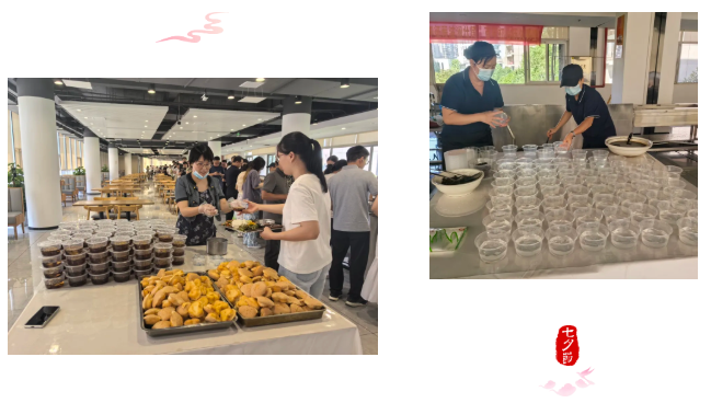 此外,食堂还贴心准备了消暑佳品——爱心冰凉粉和爱心蛋糕。一碗碗晶莹剔透的冰粉配上爱心蛋糕,瞬间驱散了午后的暑气,为大家带来了一抹沁入心脾的凉爽。