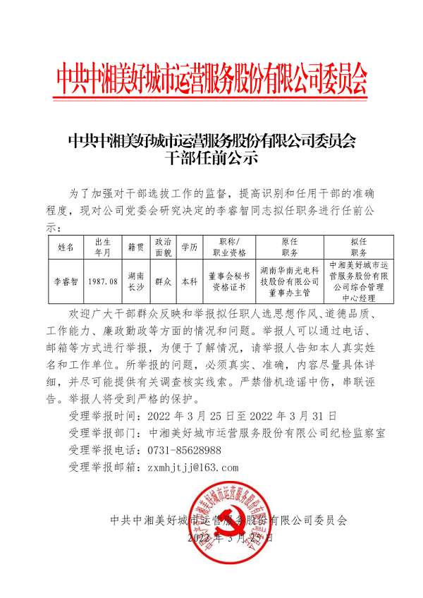 中共中湘美好城市运营服务股份有限公司委员会干部任前公示