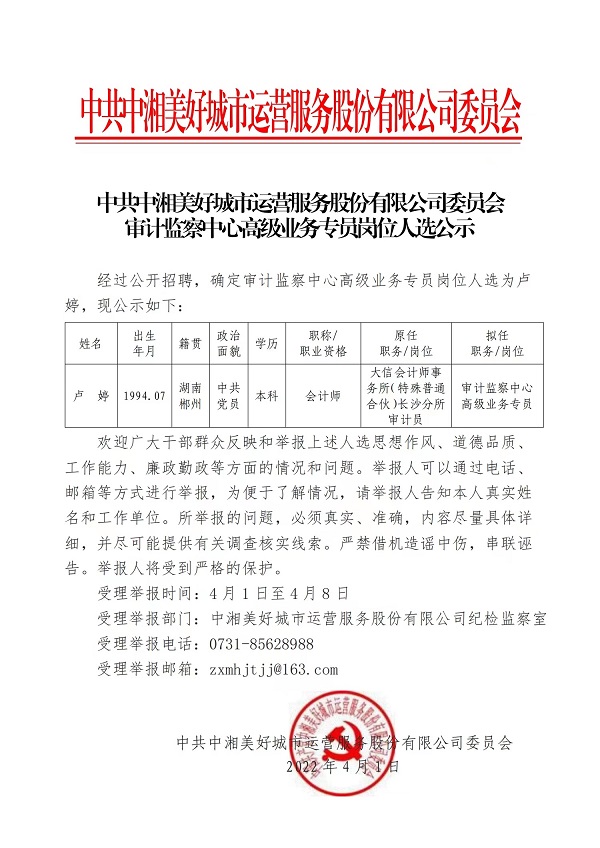 中共中湘美好城市运营服务股份有限公司委员会审计监察中心高级业务专员岗位人选公示