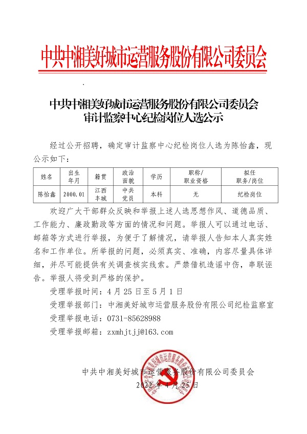 中共中湘美好城市运营服务股份有限公司委员会审计监察中心纪检岗位人选公示