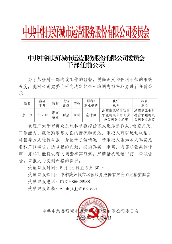 中共中湘美好城市运营服务股份有限公司委员会干部任前公示