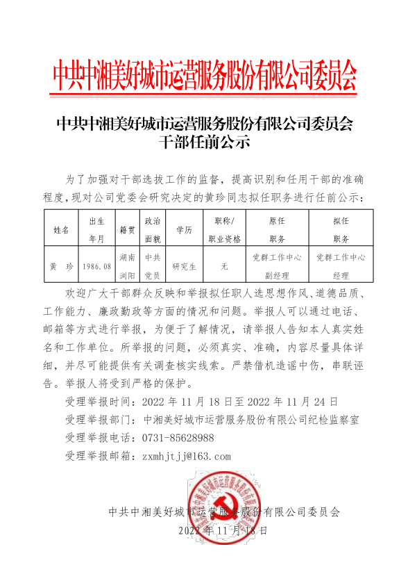 中共中湘美好城市运营服务股份有限公司委员会干部任前公示