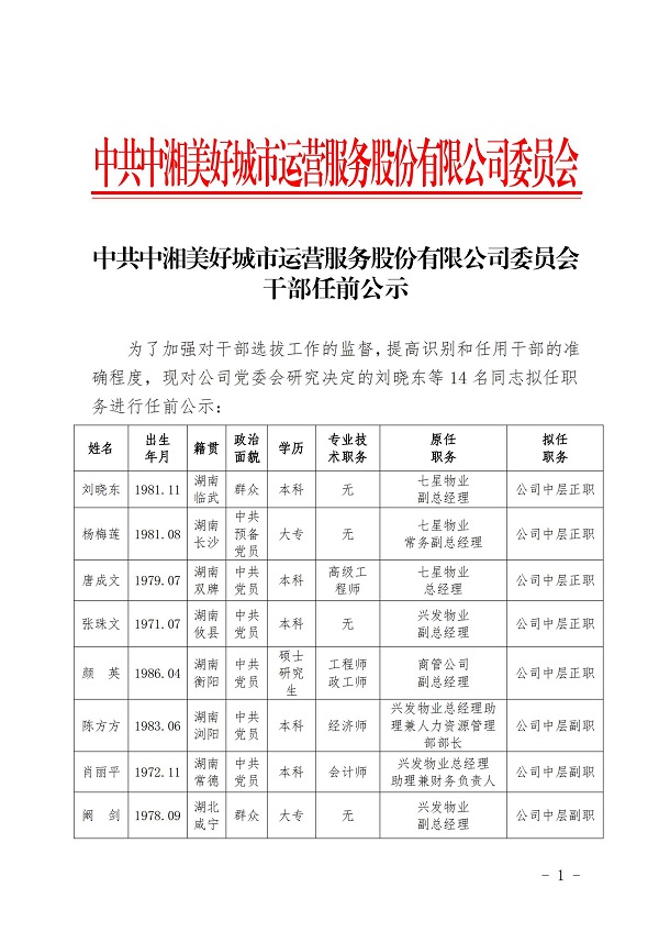上一篇:中共中湘美好城市运营服务股份有限公司委员会干部任前公示