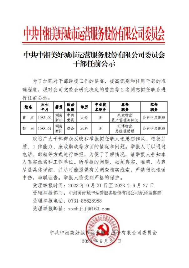 中共中湘美好城市运营服务股份有限公司委员会干部任前公示